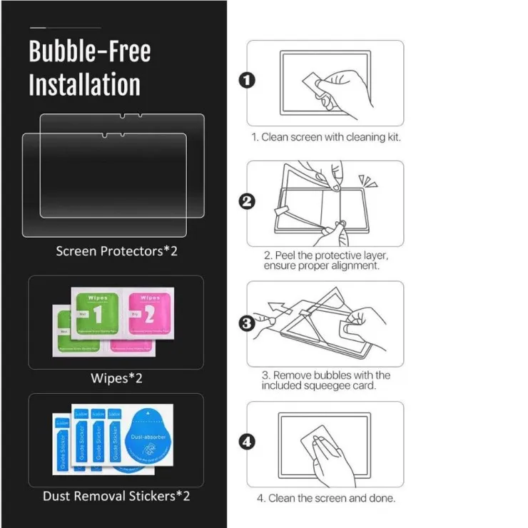 Designed for hassle-free application, the screen protectors feature an advanced silicone adhesive backing that clings firmly to your tablet screen. This ensures a bubble-free, secure fit that lasts, without the need for glue or complicated tools. Included in the package are cleaning wipes and dust removal stickers to prepare your device for a flawless installation.