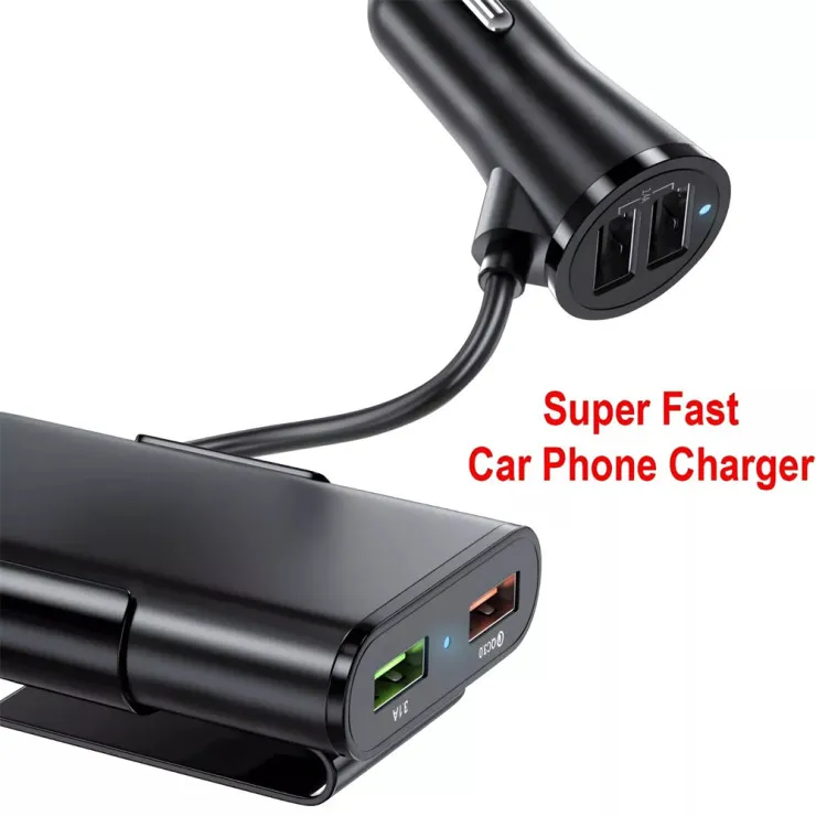 This versatile car charger features a long 1.8M cable and four USB ports, perfect for charging multiple devices. Its compact design ensures it fits seamlessly into your car, providing a practical solution for keeping your devices charged on the go.