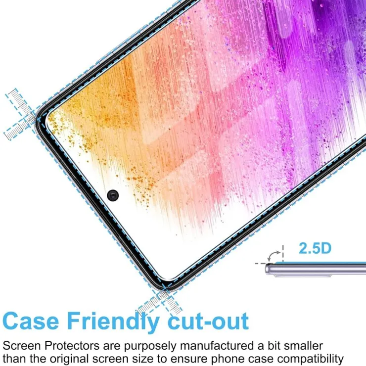 Compatible Brand | For Samsung Galaxy | Compatible Model | Samsung Galaxy A73 5G | Type | Screen Protector | Features | Full Coverage, Anti-Scratch, Anti-Shatter, Tempered Glass, Oleophobic Coating, Rounded Edges, Slim Glass, Surface Hardness 9H, Ultimate Touch Sensitivity & Whole Transparency | Material | Tempered Glass | Color | Ultra Clear | Manufacturer Warranty | 30 Days | Package Include | 2X Screen Protector |