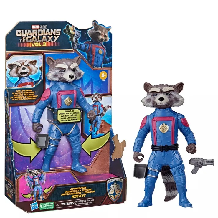 | Brand | Hasbro | Character | Rocket | Type | Action Figure | Features | 8-inch figure with facial transformation, blaster accessory, movie-inspired suit, rotating ears, expressive details, and durable Hasbro quality for play or display. | Material | Plastic | Color | Blue | Item model number | F7914 | Manufacturer recommended age | 4 months and up | Product Dimensions | 20.32 x 20.32 x 20.32 cm; 160 g | Package Include | Rocket Raccoon Action Figure |