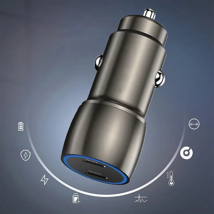 | Items Included | Car Charger | Material | Zinc Alloy Shell | Voltage | 12 V | Features | Fast Charge, Full Coverage, Heavy Duty, LED, Shockproof, 40W Fast Charging, Dual Type-C Ports | Connectivity | Dual USB Type-C | Mounting Type | Clamp | Package Includes | 1 X Dual Type-C Car Charger |