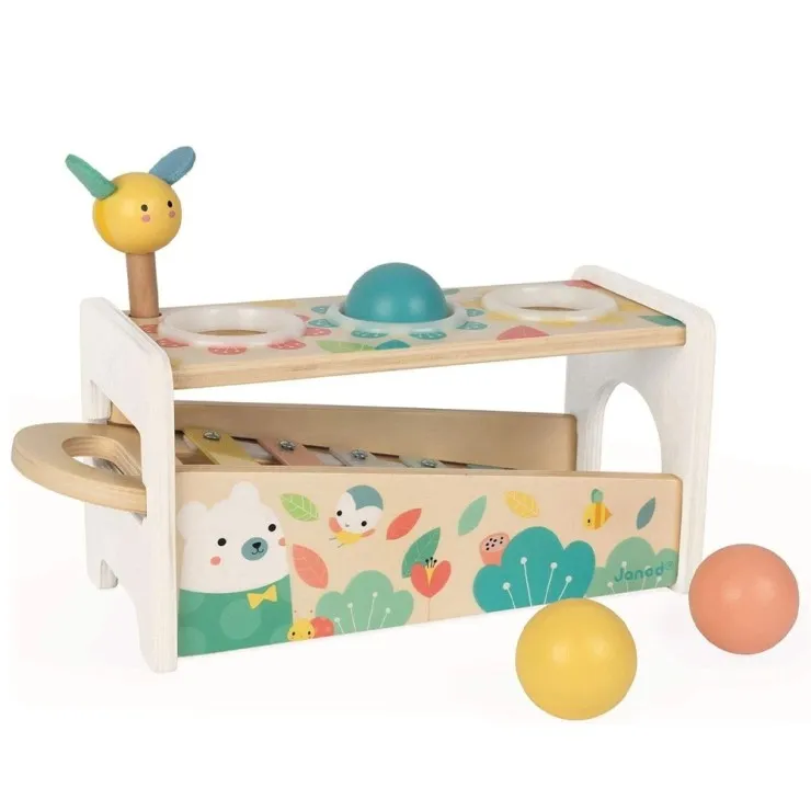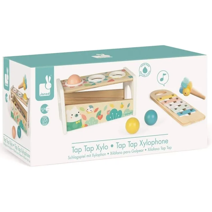 | Brand | Janod | Type | Toy | Features | 2-in-1 toy with xylophone and pounding bench, bee hammer, 3 balls, pastel colors, wooden build, safe paint, educational and durable desig | Material | Wood | Colour | Multi Colors | Model Number | J05155 | Educational Objective(s) | Imagine, invent, create | Manufacturer recommended age | 12 months and up | Product Dimensions | 40.64 x 33.02 x 22.86 cm; 790 g | Package Include | 1X Pure Tap Tap Xylophone Toy |