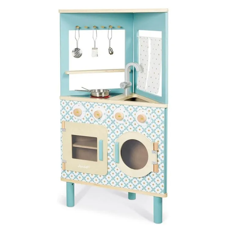 Perfect for small spaces, this corner kitchen combines retro cement tile patterns, pastel blue tones, soft vintage curtains, and a natural wood effect, making it not only fun for kids but also a stylish addition to any playroom or living space. Its unique triangular shape allows it to fit neatly into a corner or act as a standalone island, making it versatile for different room layouts.