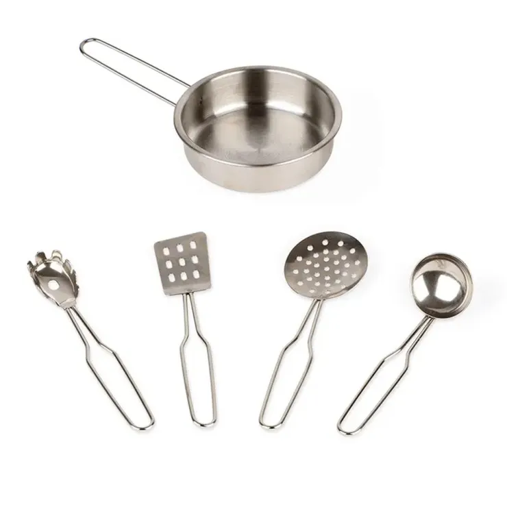- Includes: Wooden kitchen + 5 metal utensils (pan, spatula, colander, pasta spoon, ladle)
