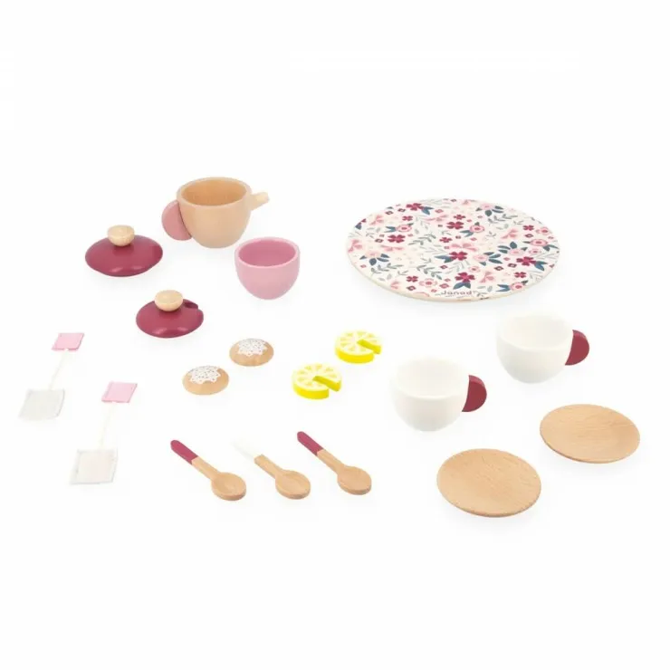 Janod Kids Tea Set – FSC Wooden Pretend Play Tea Party Toy with Tray, Cups, Teapot & Accessories