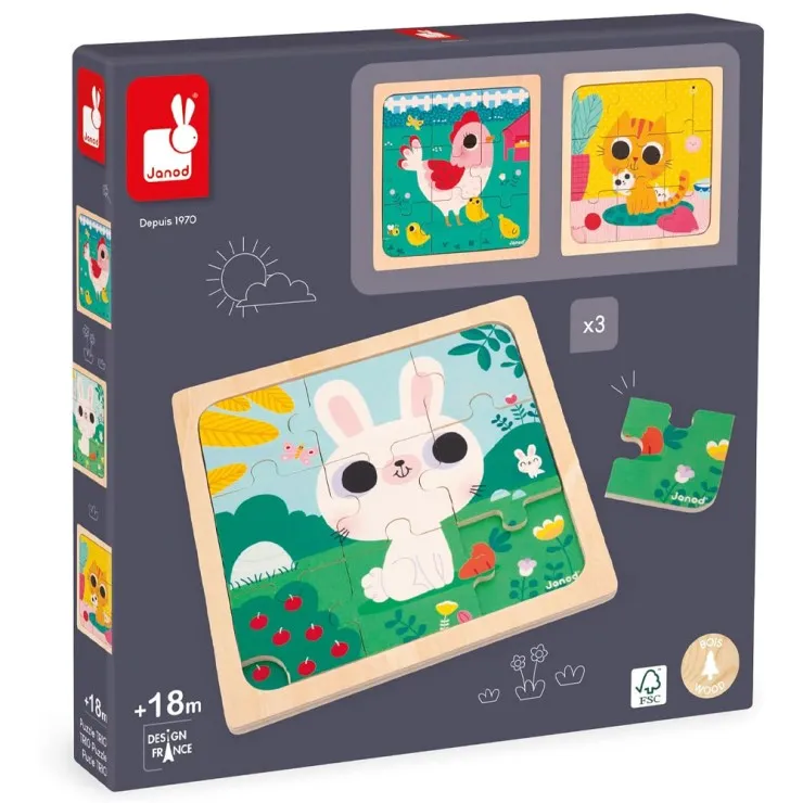 Brand | Janod | Type | Wooden educational puzzle set | Features | Set of 3 wooden 9-piece animal puzzles (hen, cat, rabbit), FSC-certified, easy-grasp pieces, 20x0.8x20 cm, ages 18 months+. | Material | FSC Wood | Theme | White Rabbit | Item model number | J07112 | Number of Pieces | 9 | Age Level | 18 Months+ |