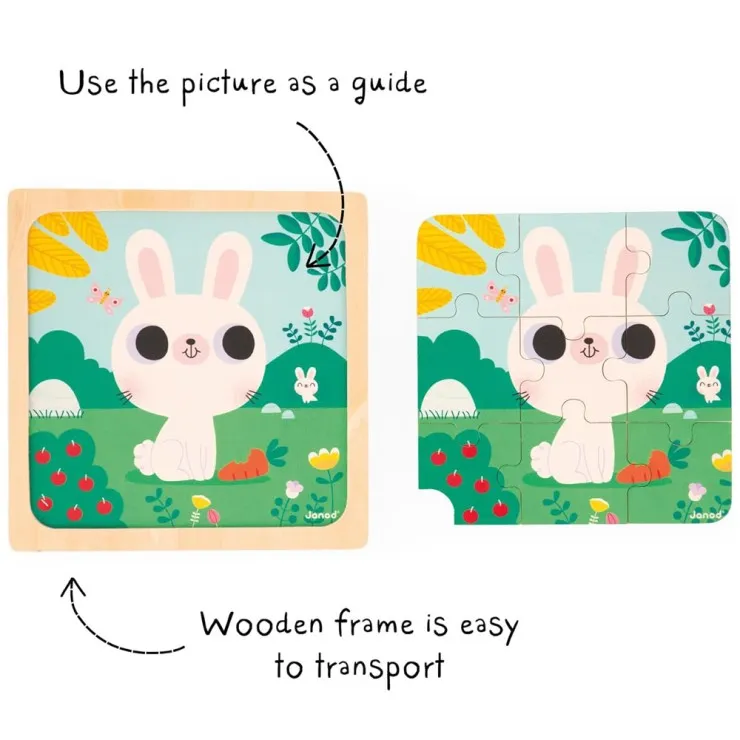 Janod Wooden Puzzle Set | 3x 9-Piece Animal Puzzles Hen, Cat & Rabbit (18 Months+)