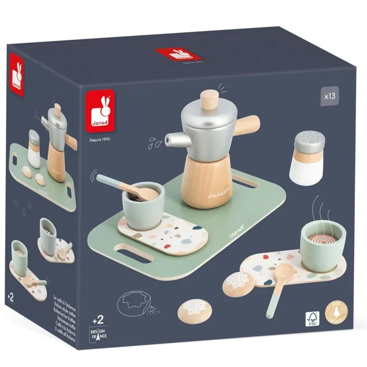For over 50 years, Janod has been designing timeless, creative, and educational toys that encourage children to learn through play. The Italian Coffee Set is part of their beautifully crafted pretend play range, designed to inspire children to dream, imagine, and share magical moments with family and friends.