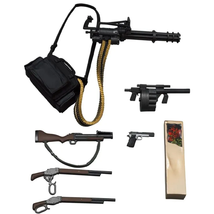 This edition comes with a generous selection of weapons and display accessories, each crafted to match its film counterpart. The figure includes sunglasses that can be worn or removed, multiple interchangeable hands for expressive posing, two distinct shotguns, a pistol for tactical scenes, the devastating grenade launcher, the unforgettable minigun equipped with ammo feed bag, and even the memorable box of roses from the mall scene reveal. These accessories allow collectors to recreate the film’s most memorable moments with cinematic accuracy.