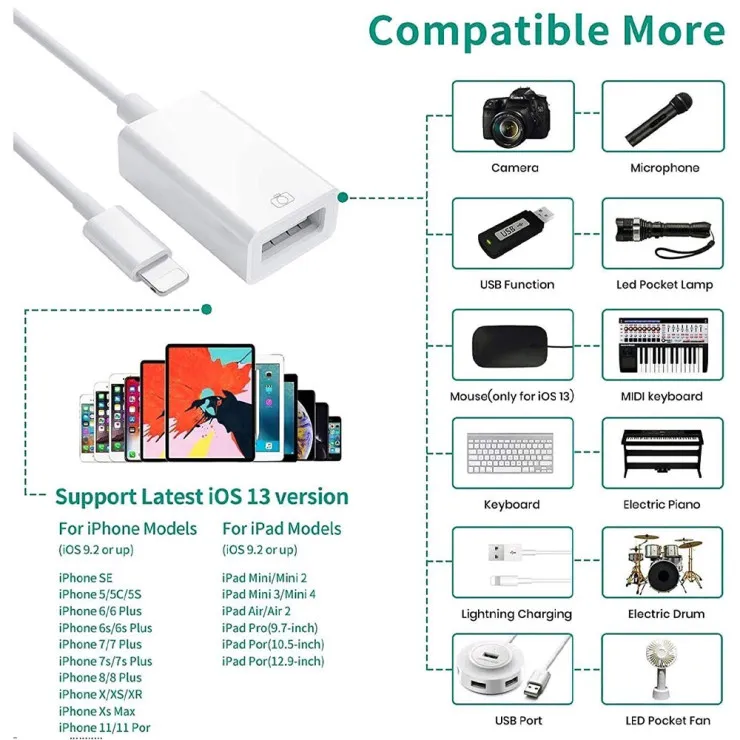 Supports iPhones, iPads, and other iOS devices for seamless connectivity with USB drives, keyboards, and more.