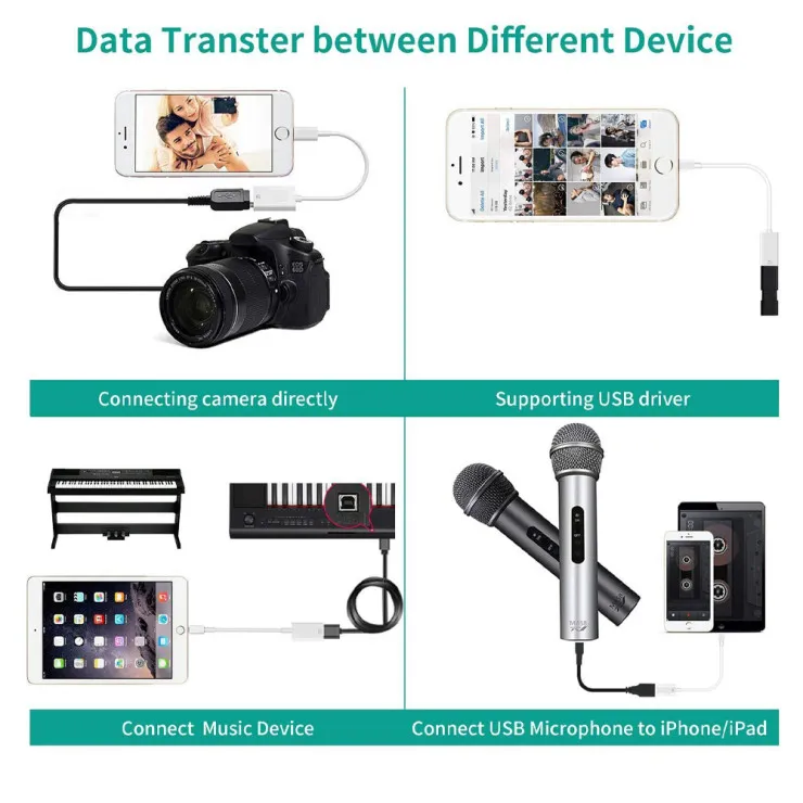 | Compatible Brand | For Apple | Compatible Model | Camera,Mic,USB Function,LED Pocket Lamp,ios Mouse,MIDI Keyboard,Electric Piano,Lightining Charging,USB Port | Features | DATA SYNC, FAST, OTG, CAMERA ADAPTER, DATA TRANSFER | Material | ABS | Type | OTG | Color | White | Warrenty | 30 days | Package included | 1 X OTG Adaptor |
