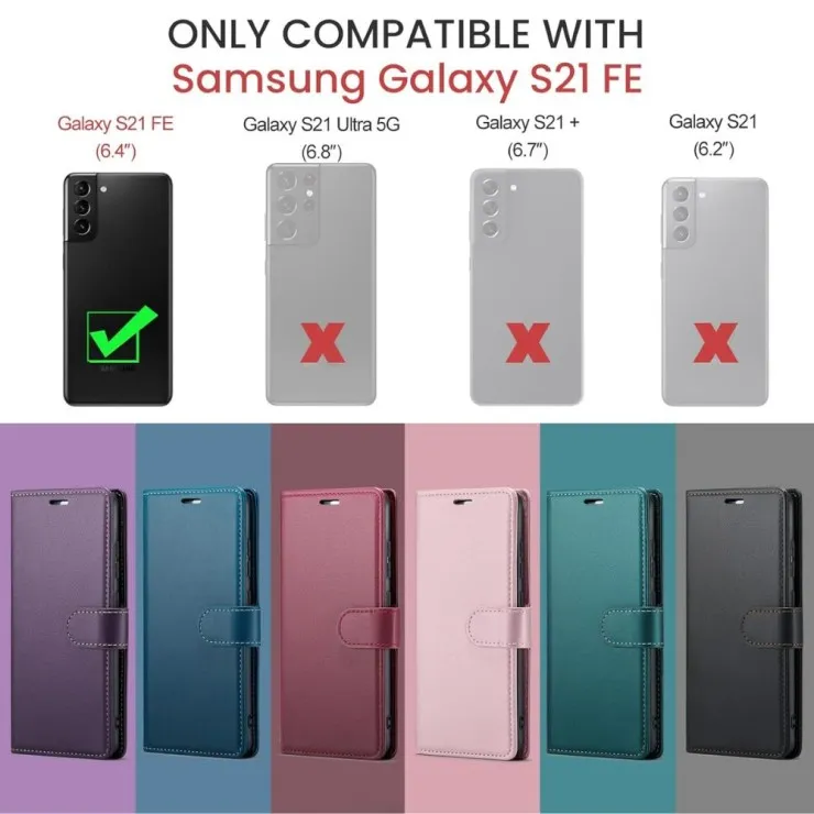 Compatible Brand | For Samsung | Compatible Models | For Samsung Galaxy S21 FE | Features | 360 Protection, Card Pocket, Full Coverage, Heavy Duty, Lightweight, Magnetic, Shockproof, 2 Pocket Card Slots, Flip Stand Cover Card Holder | Type | Wallet Book Case | Color | Black, Blue, Purple & Rose | Material | PU Leather | Manufacturer Warranty | 30 Days | Package Includes | 1X Leather Magnetic Wallet Case |