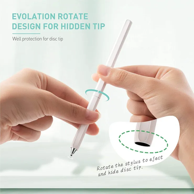 - New Ergonomic Integrated pen housing. Evolation rotate design for Hidden tip. We design this stylus with more easy way to use. No cap design, no need to have cap or cover anymore. When you rotate the stylus, you can easily eject and hide disc tip.